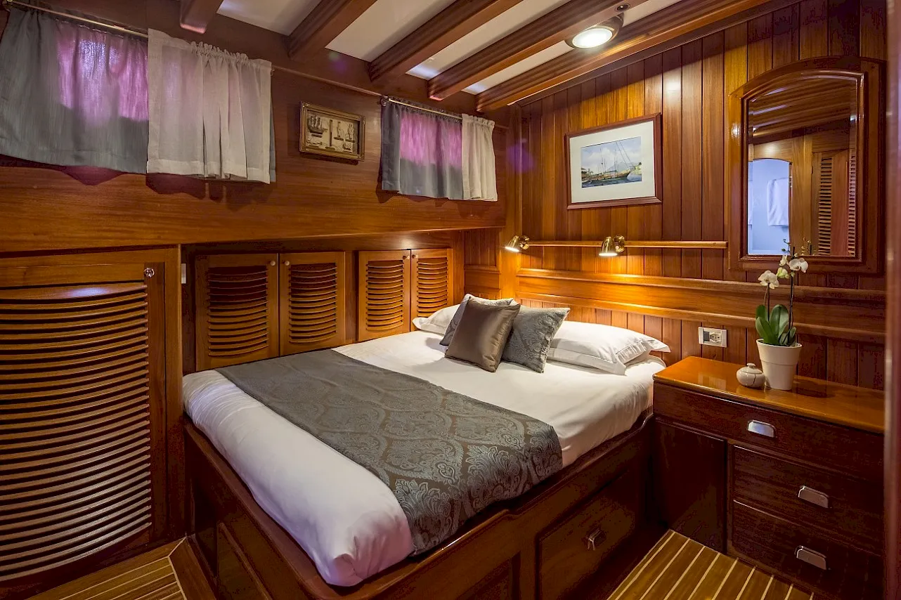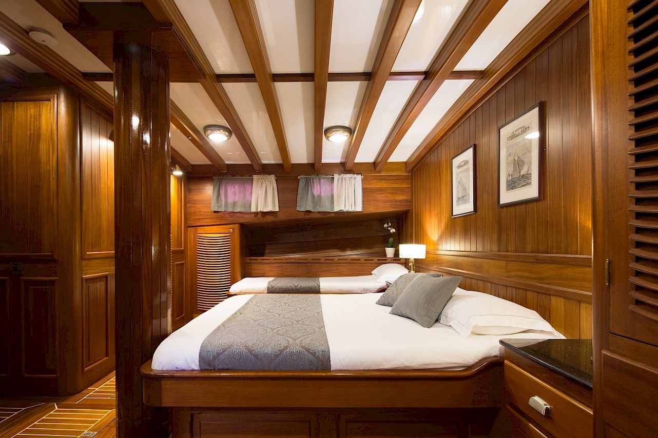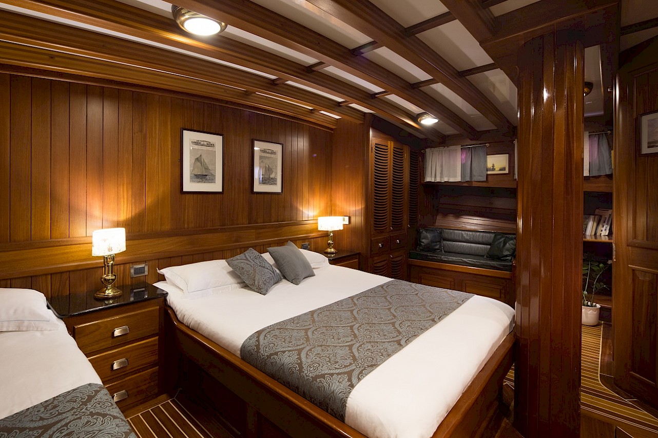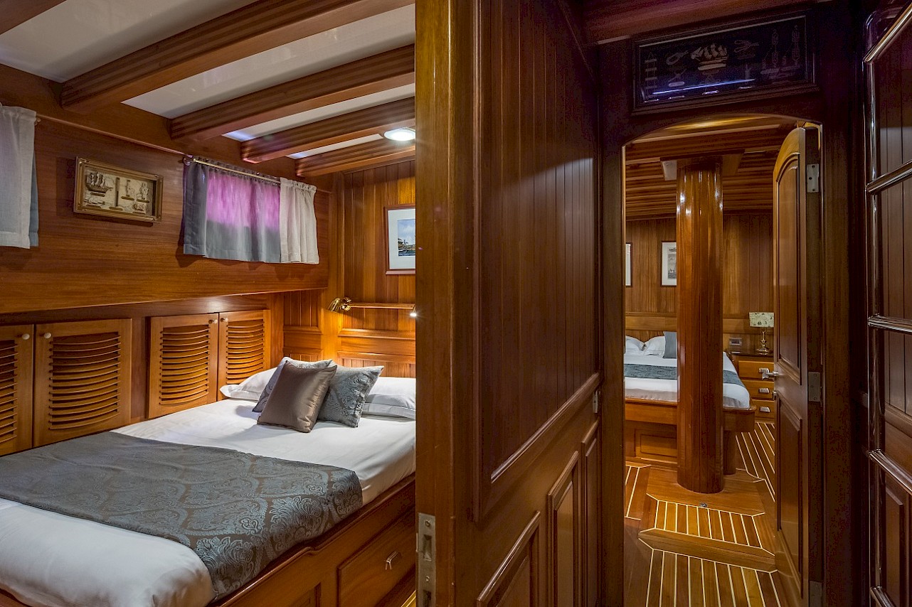 All cabins with ensuite bathroom. The full-beam master cabin has a king size berth and an additional single berth. The three guest cabins are of a comparable size, each with ample storage space. All berths are very comfortable. Opening portholes supply abundant fresh air. | |