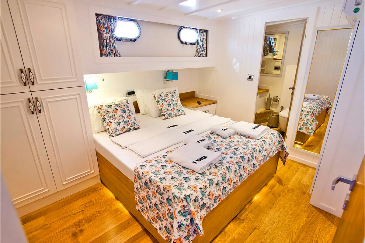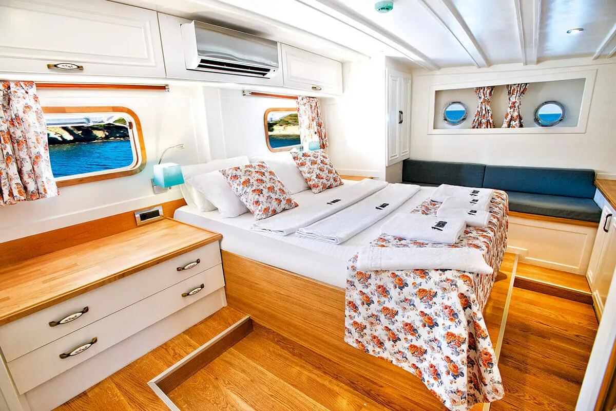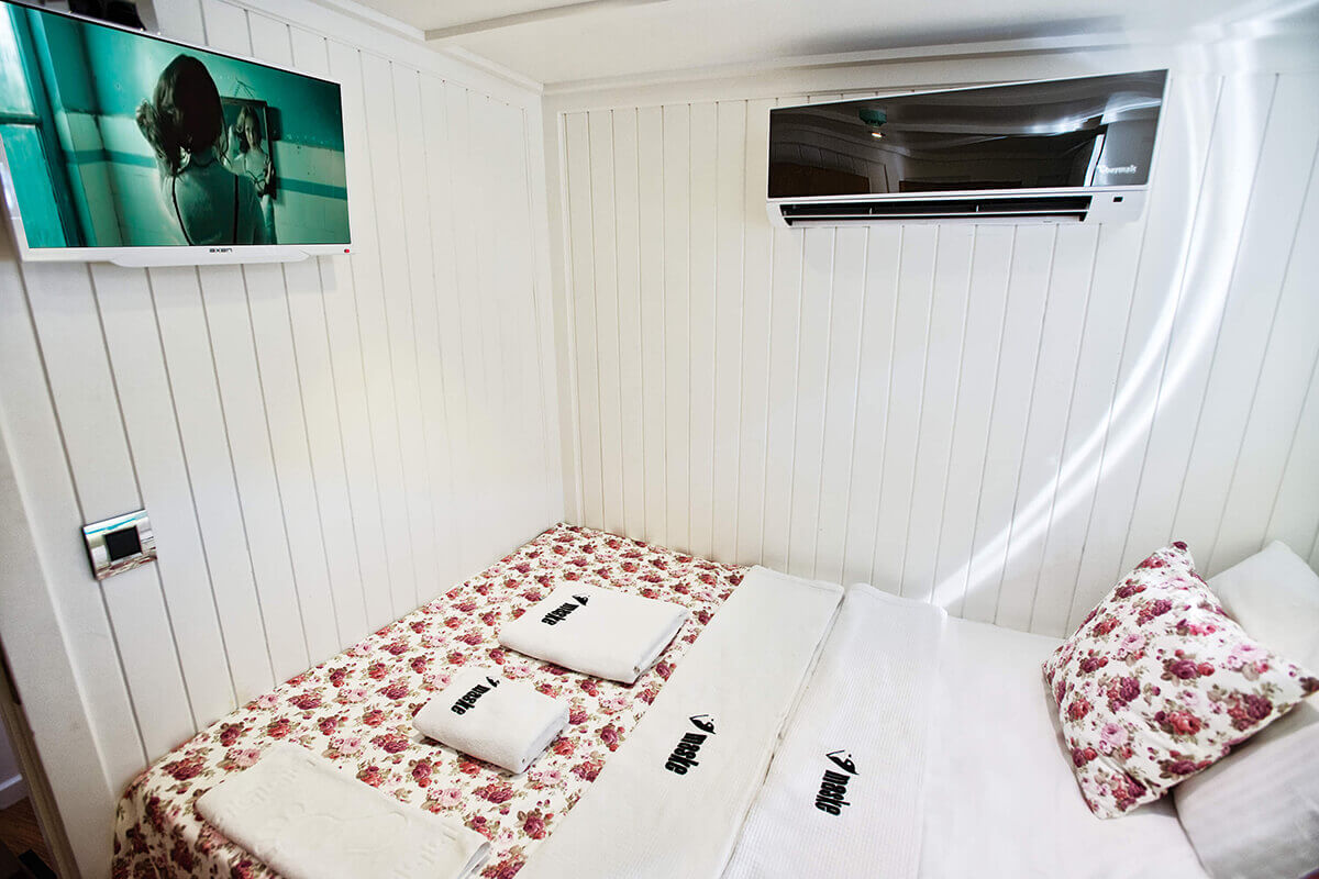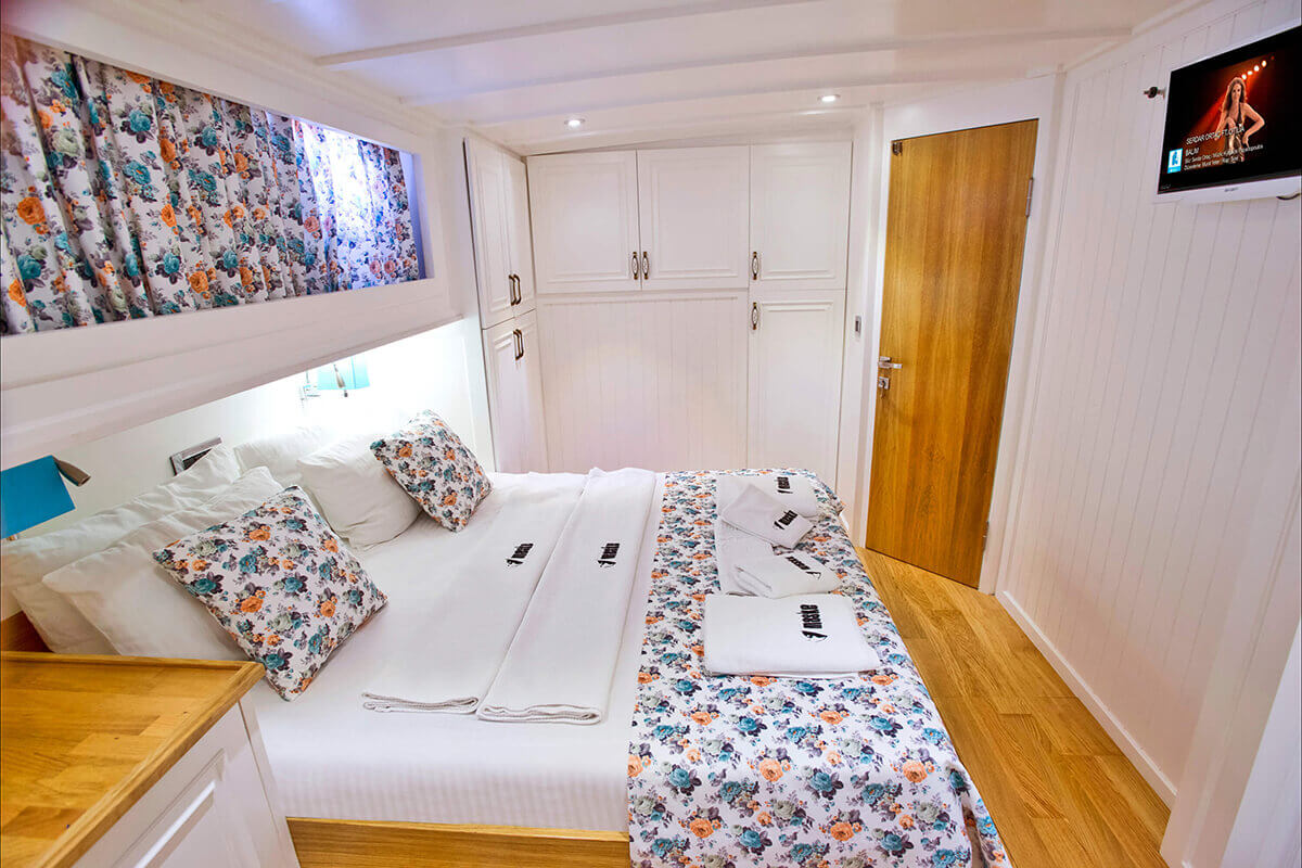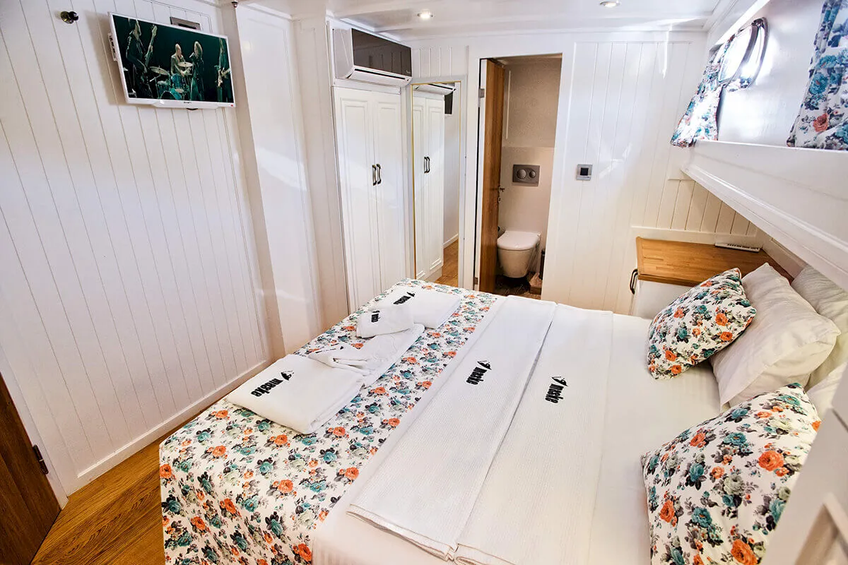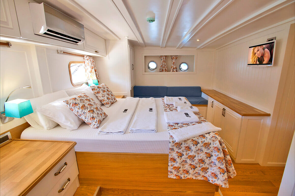 1 Master, 4 Double staterooms. Each cabin has its private ensuite. Each stateroom has 180X200 anti-bacterial orthopedic bed, AC, 22" LED TV, wardrobe, free bathroom towels, sunbathing towels, shampoo, shower gel, soap, sandals. | |