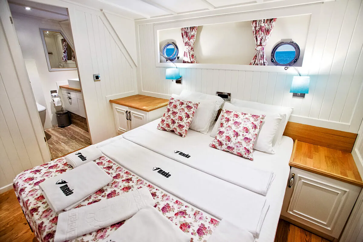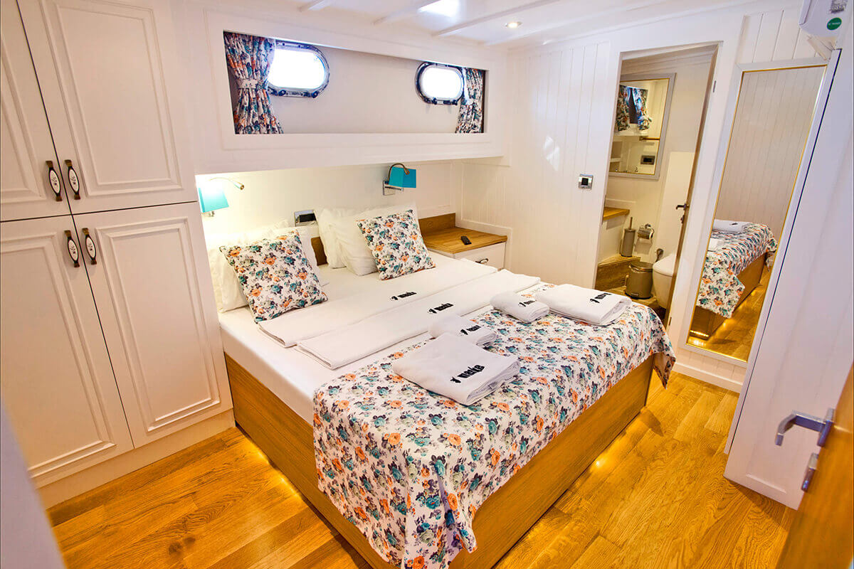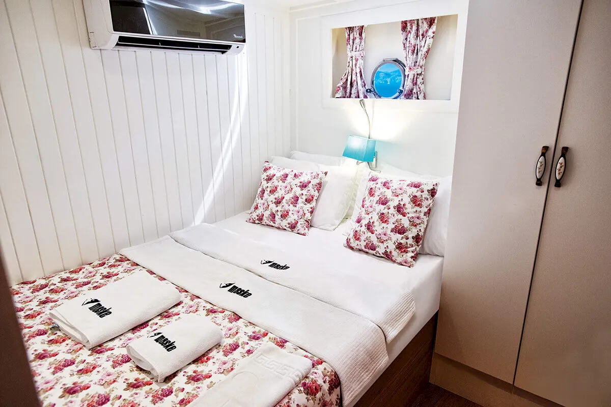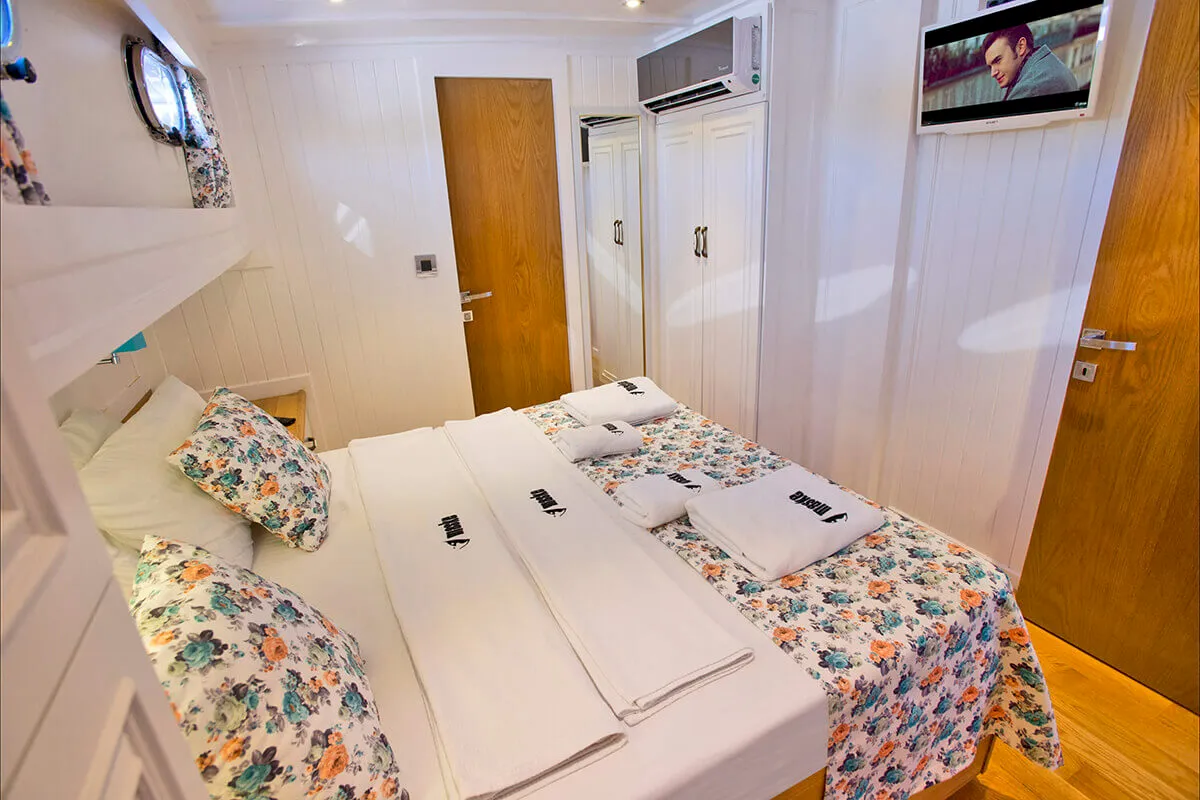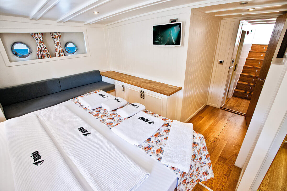 1 Master, 4 Double staterooms. Each cabin has its private ensuite. Each stateroom has 180X200 anti-bacterial orthopedic bed, AC, 22" LED TV, wardrobe, free bathroom towels, sunbathing towels, shampoo, shower gel, soap, sandals. | |