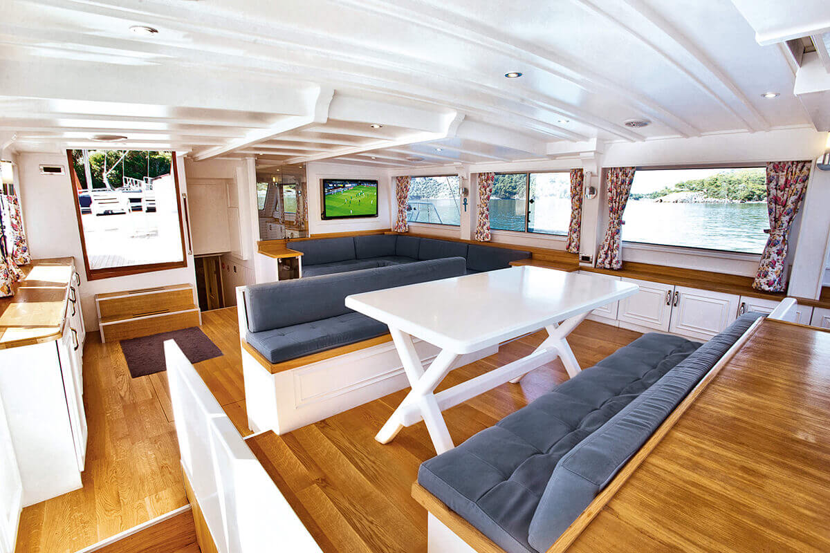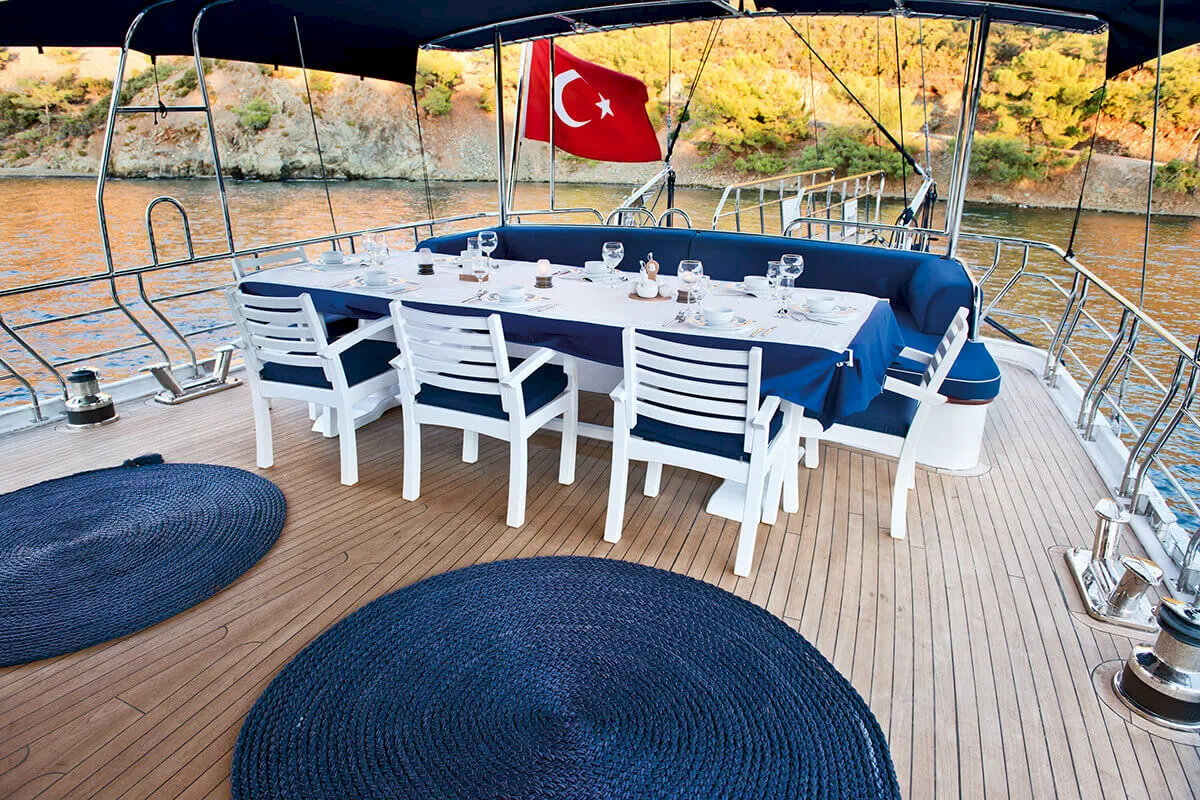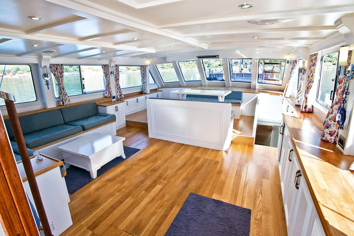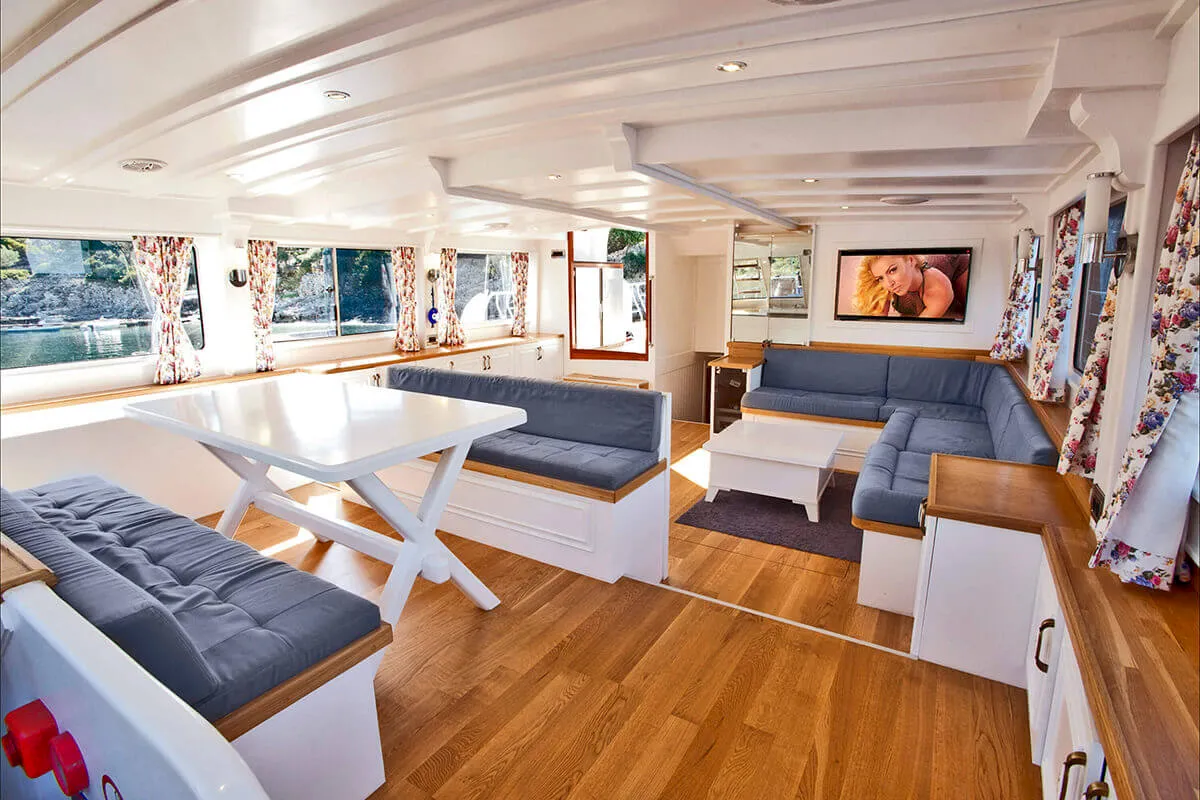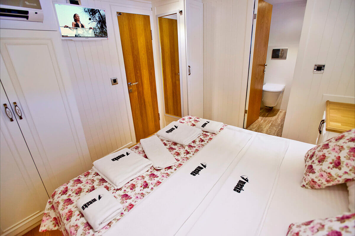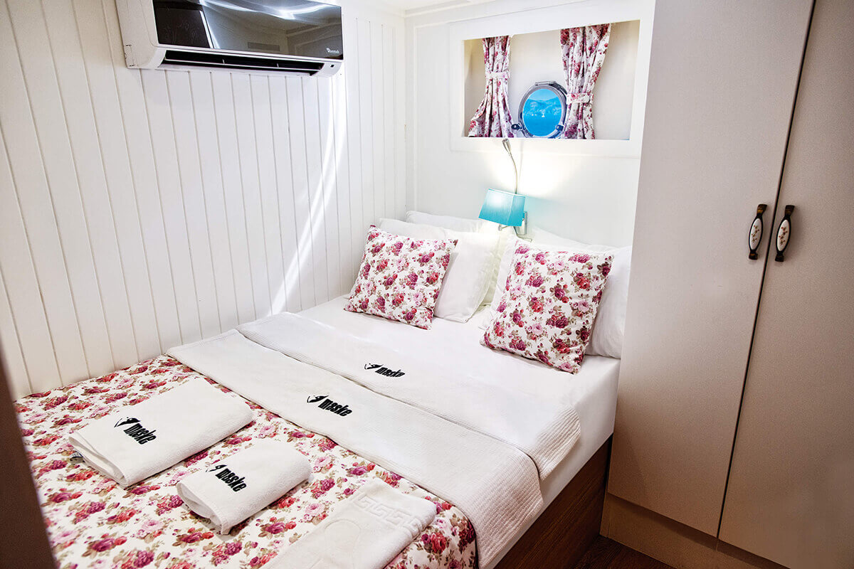 1 Master, 4 Double staterooms. Each cabin has its private ensuite. Each stateroom has 180X200 anti-bacterial orthopedic bed, AC, 22" LED TV, wardrobe, free bathroom towels, sunbathing towels, shampoo, shower gel, soap, sandals. | |