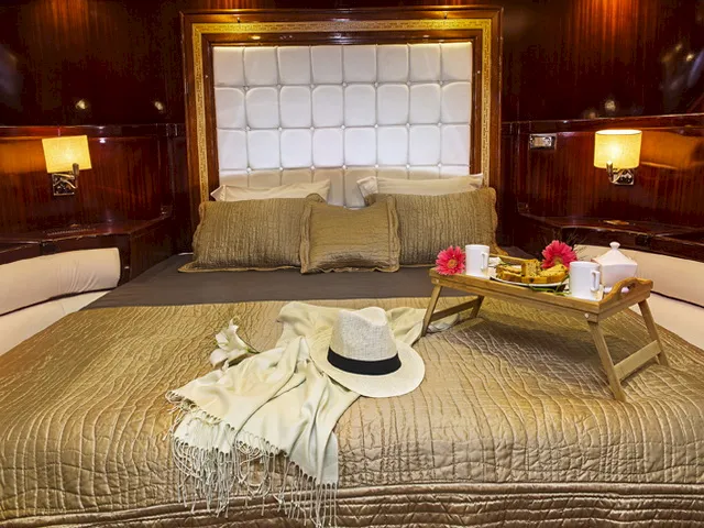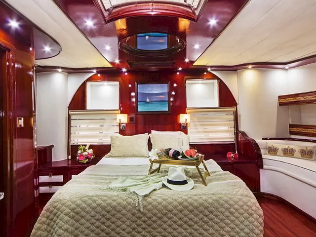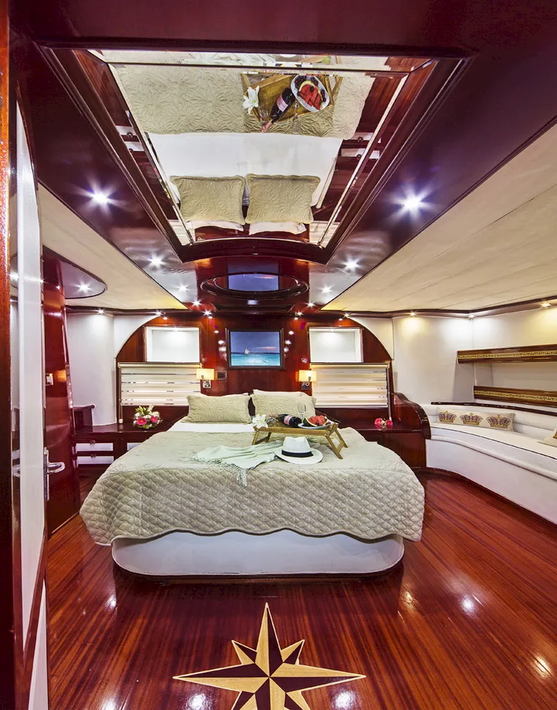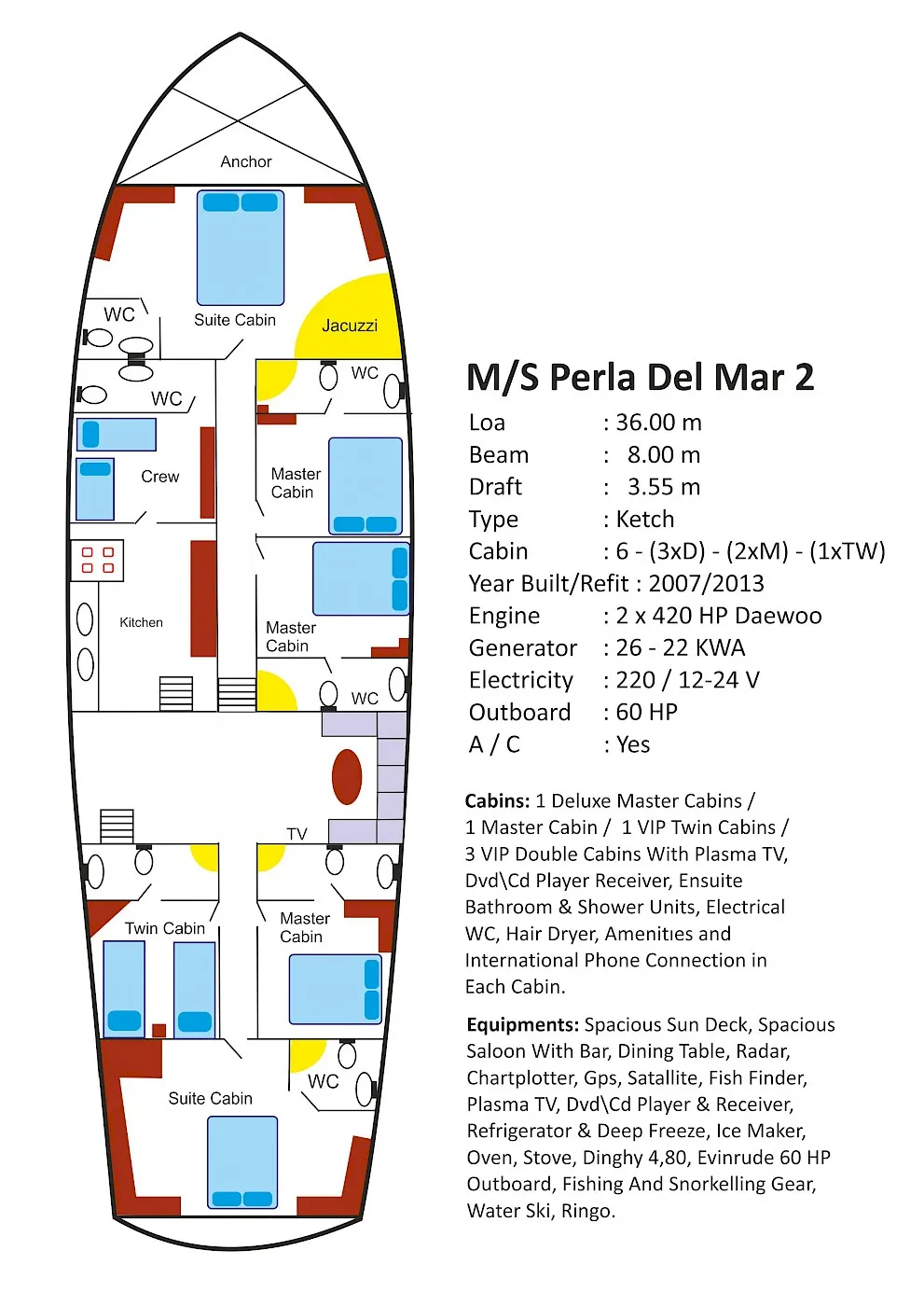 1 Deluxe Master Cabins, 1 Master Cabin, 1 VIP Twin Cabins, 3 VIP Double Cabins with plasma TV, DVD/CD player receiver, ensuite bathroom & shower units, electrical WC, hair dryer, amenities and international phone connection in each cabin. | |