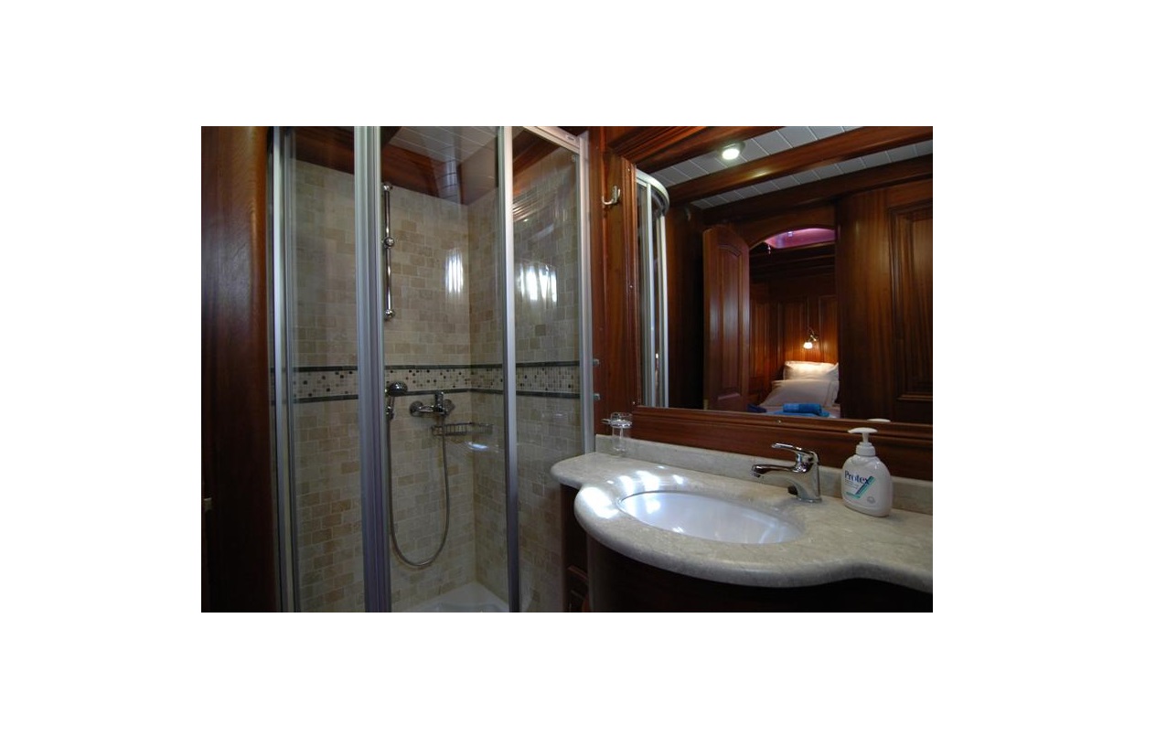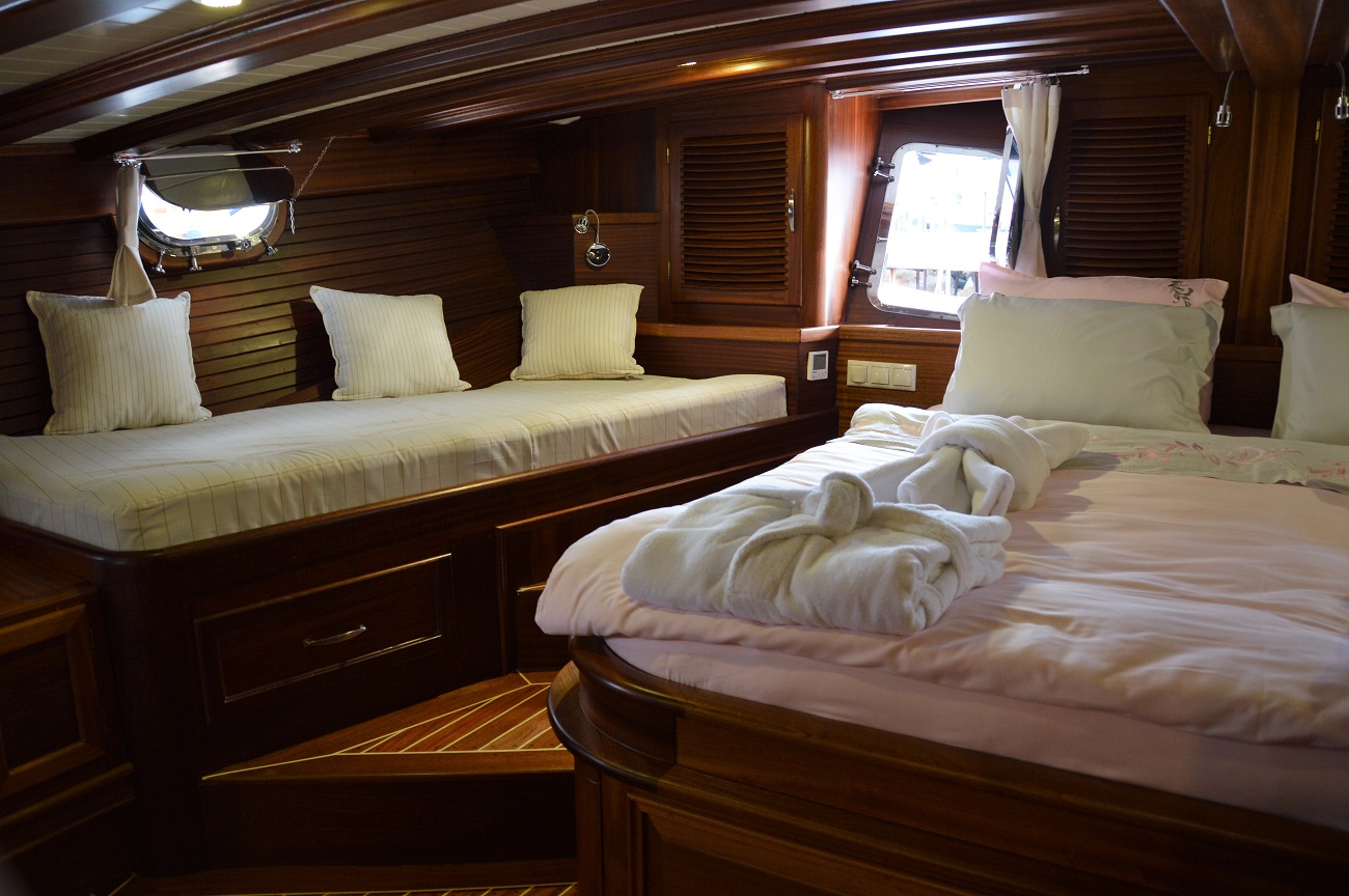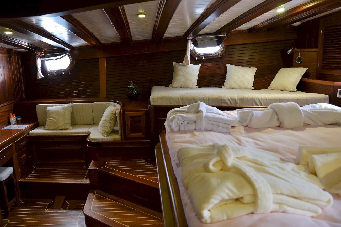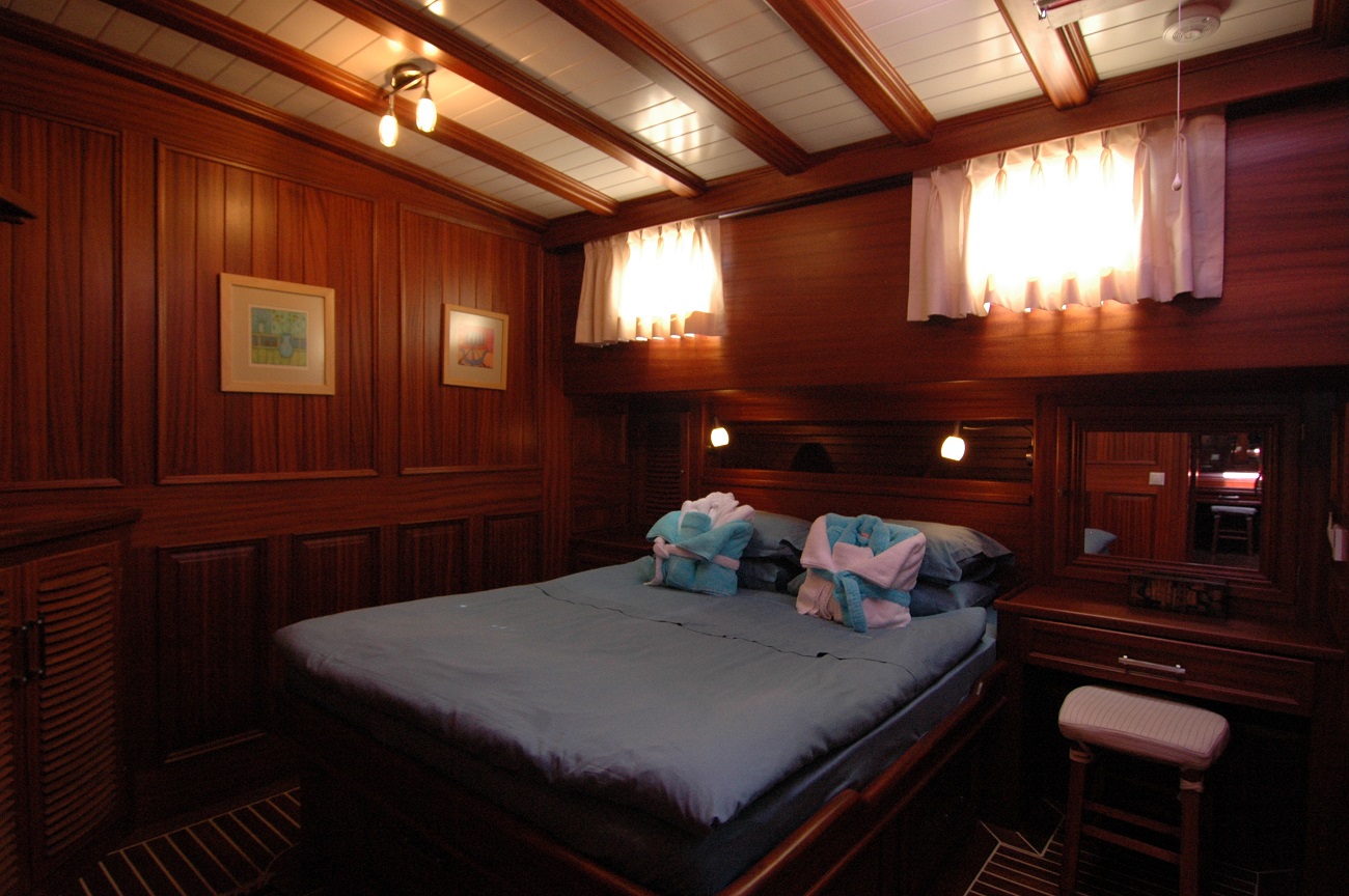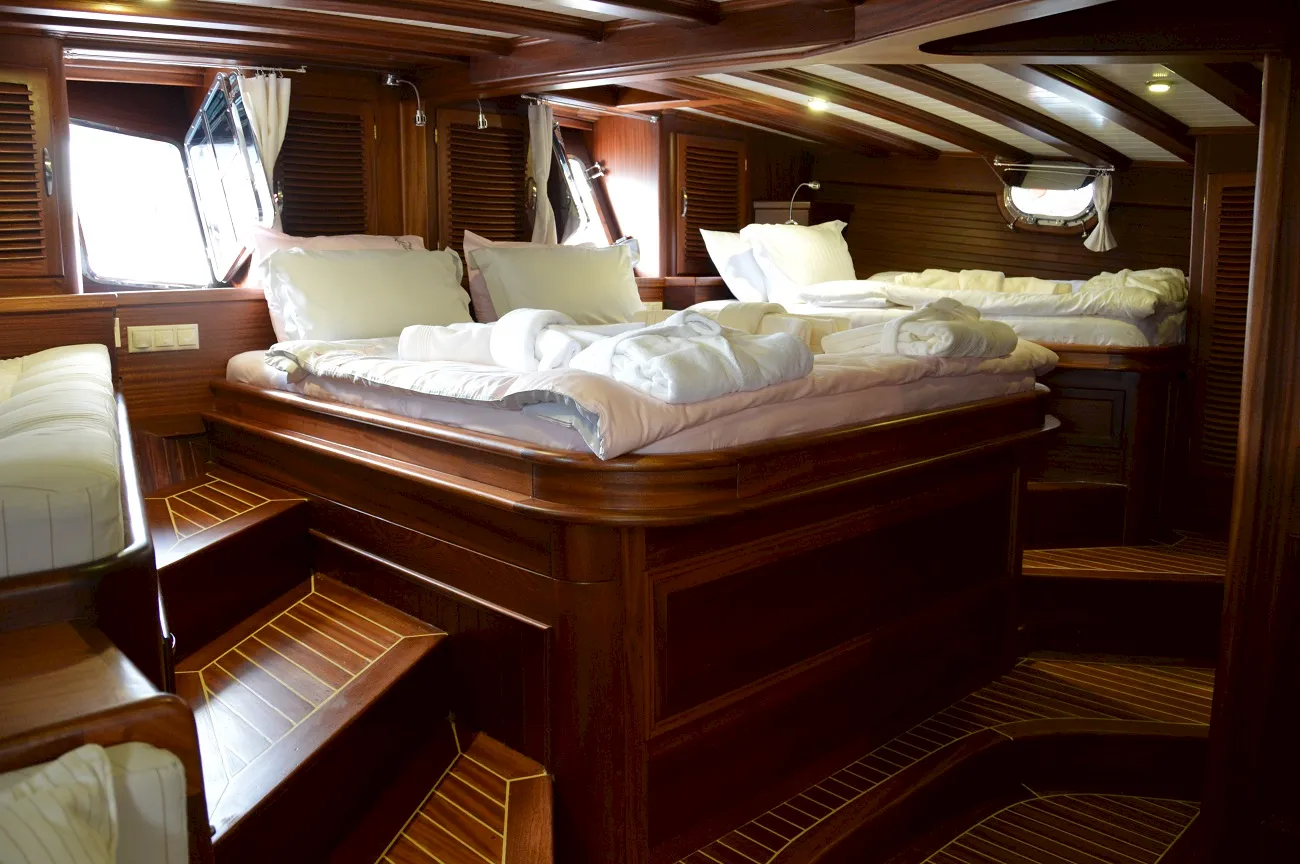 Sleeps 12 guests in 6 large cabins (+2 small children with additional child beds) 2 Master(double bed: 150 x 210 and 180 x 200 cm) 2 Double (double beds: 150 x 200) 2 Twin (single beds: 90 x 200 – which could also convert into King Size double beds upon request) Ensuite bathrooms with shower cabins and electric toilets | |